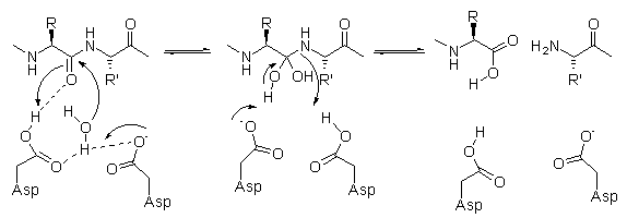 two aspartates share one proton at a physiological pH. The scissile amide bond